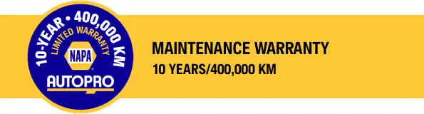 The 10/400 is a no-charge, 10-year/400,000 km limited warranty that covers repairs or replacement of critical engine components, including your transmission or transaxle, when you have your vehicle regularly maintained/repaired at any participating NAPA AUTOPRO Service Centre in Canada.
